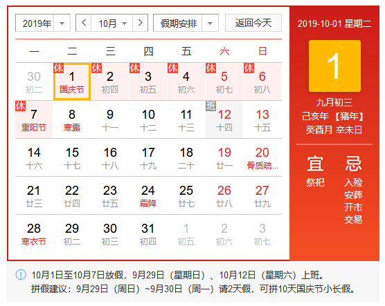 2019年北京華康普美科技有限公司,“國慶節”假期為:10月1日(星期二)至10月7日(星期一)放假調休,共7天,9月29日(星期日)和10月12日(星期六)上班。國慶節假期安排見下圖: