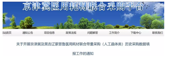 1月6日,京津冀醫(yī)用耗材聯(lián)合采購平臺發(fā)布《關(guān)于開展京津冀及黑吉遼蒙晉魯醫(yī)用耗材聯(lián)合帶量采購(人工晶體類)歷史采購數(shù)據(jù)填報工作的通知》。