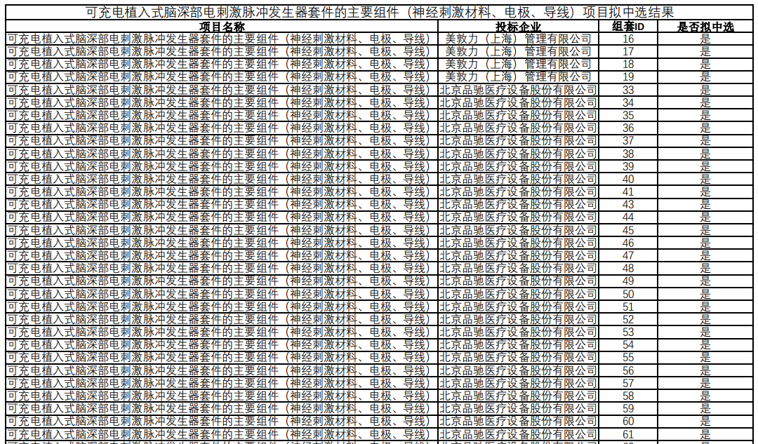 此次品馳醫療在共計64個擬中選結果中獨占60個席位,可見國產DBS類產品已經獲得國內頭部三甲醫院認可,打破了由美敦力等外資巨頭壟斷的市場格局。