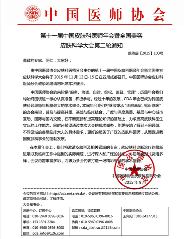 由中國醫師協會皮膚科醫師分會主辦的第十一屆中國皮膚科醫師年會暨全國美容皮膚科學大會將于2015年11月在成都世紀新城國際會展中心召開。中國醫師協會的宗旨是“服務、協調、自律、維權、管理、提高”,歷屆年會我們均始終圍繞這一核心認真準備,積極參與。
