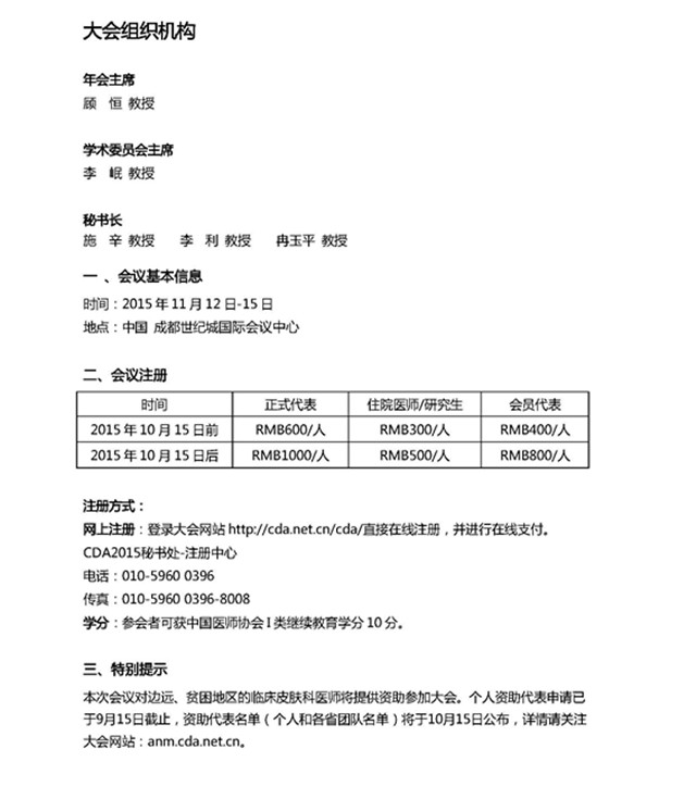 在本屆年會上,我們將邀請皮膚科及相關領域的專家,就皮膚科診斷治療的最新進展以及臨床工作中碰到的實際問題,進行深入和廣泛的討論。中國醫師協會皮膚科醫師分會誠摯地邀請您出席本次盛會。