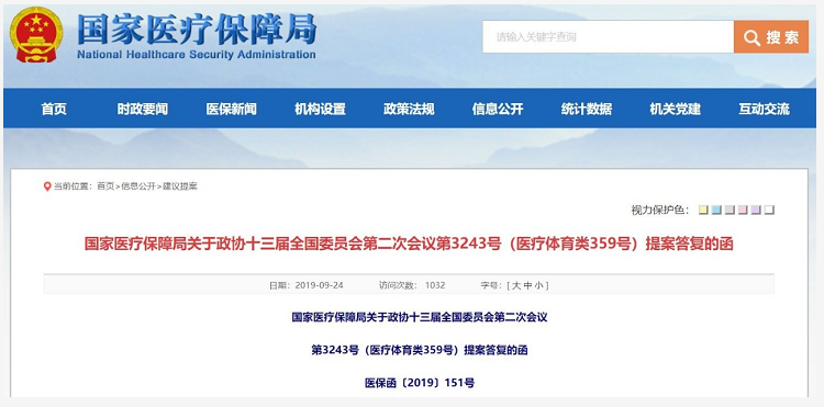 9月24日,國家醫(yī)保局發(fā)布《國家醫(yī)療保障局關(guān)于政協(xié)十三屆全國委員會第二次會議第3243號(醫(yī)療體育類359號)提案答復(fù)的函》(下稱《提案答復(fù)》)。