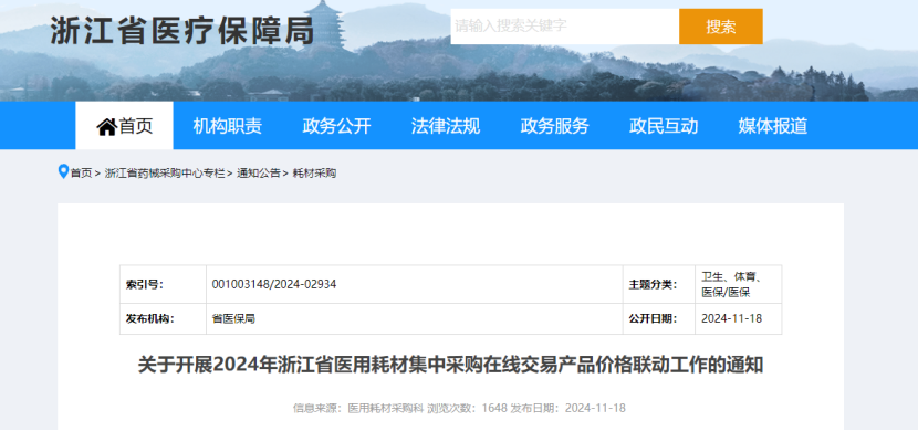 近日,浙江醫保局發布《關于開展2024年浙江省醫用耗材集中采購在線交易產品價格聯動工作的通知》,開展2024年浙江省醫用耗材集中采購在線交易產品價格聯動工作。
