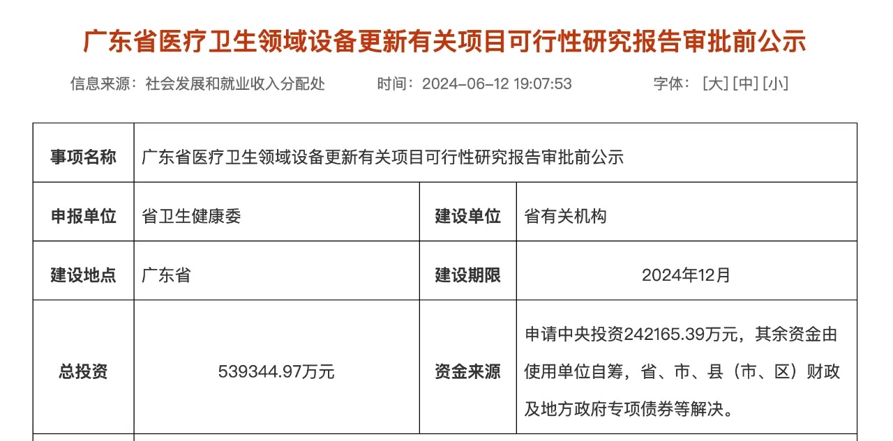 6月12日,廣東發改委官網發布《廣東省醫療衛生領域設備更新有關項目可行性研究報告審批前公示》(以下簡稱《公示》)。