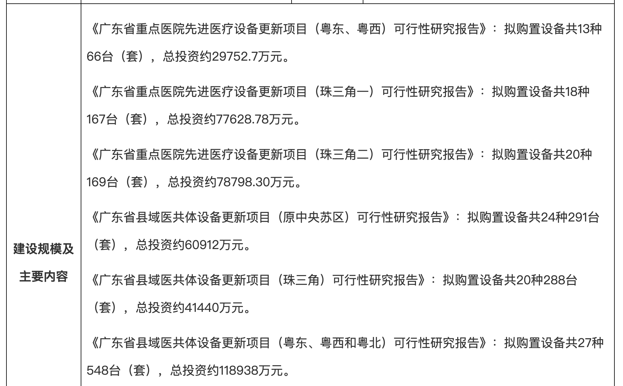 《廣東省縣域醫共體設備更新項目(粵東、粵西和粵北)可行性研究報告》:擬購置設備共27種548臺(套),總投資約118938萬元。